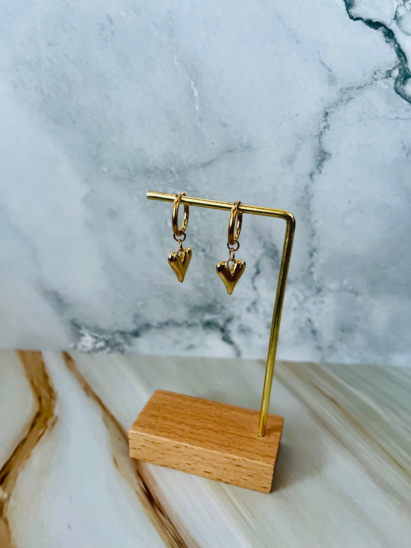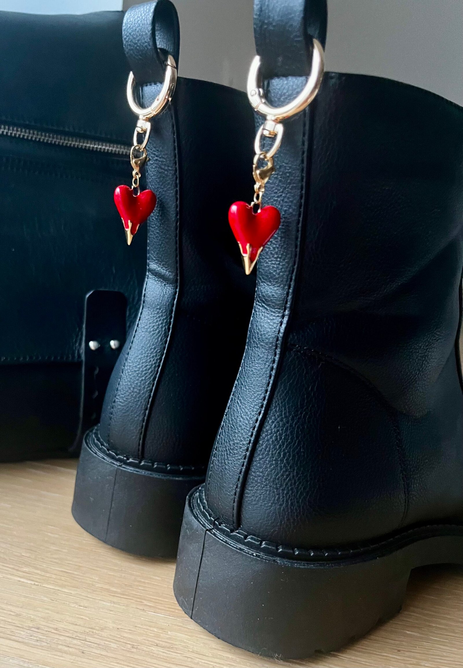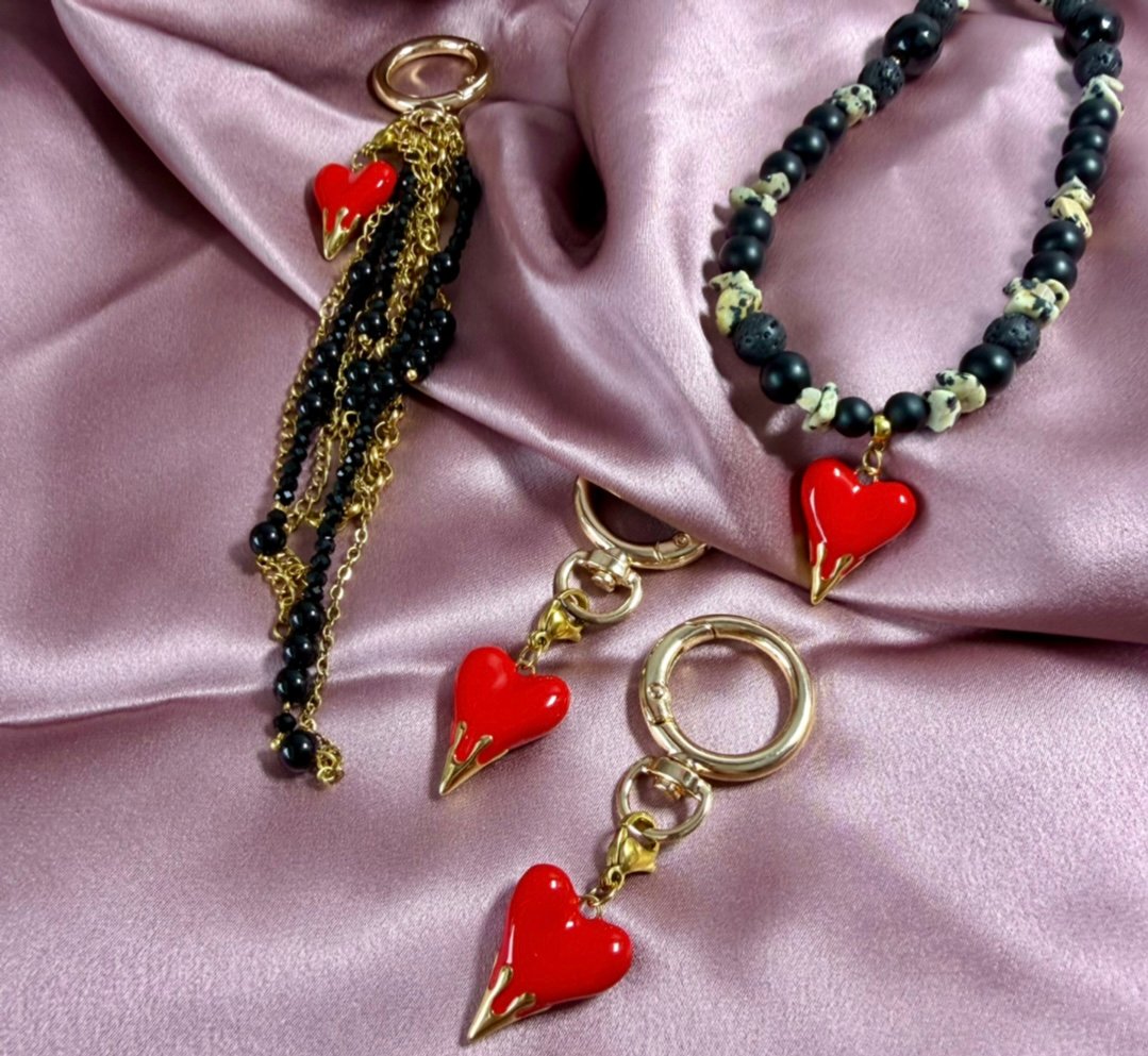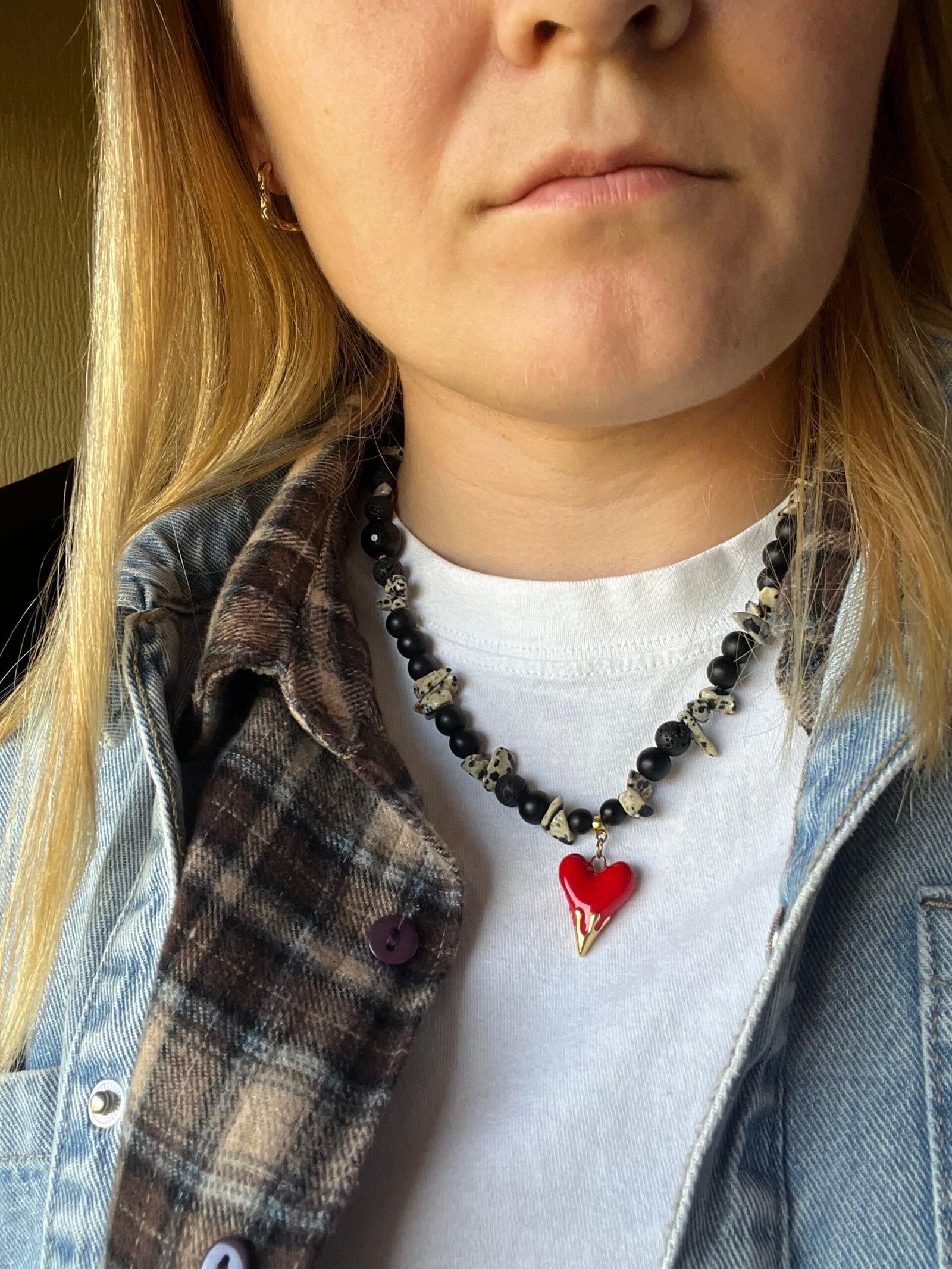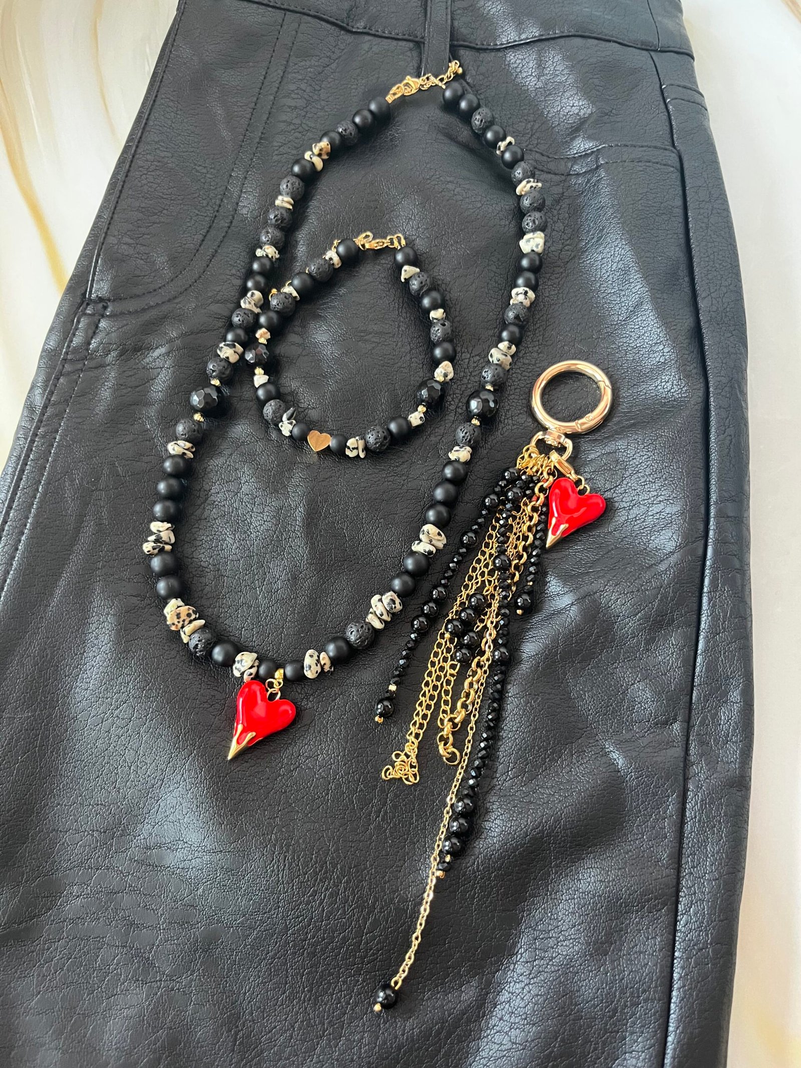 Rankų darbo išskirtinis papuošalų rinkinys sukurtas derinant dalmatininius karoliukus, matinius lava karoliukus bei įvairių faktūrų oniksą – matinį ir briaunuotą blizgų. Dizainą papildo ryški širdelės formos detalė iš nerūdijančio plieno, kuri suteikia charakterio ir išskirtinumo.