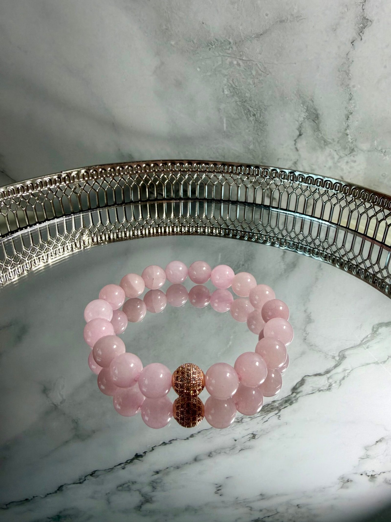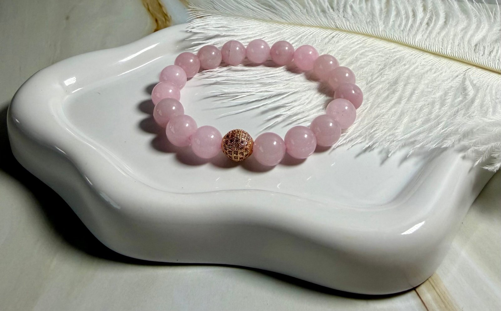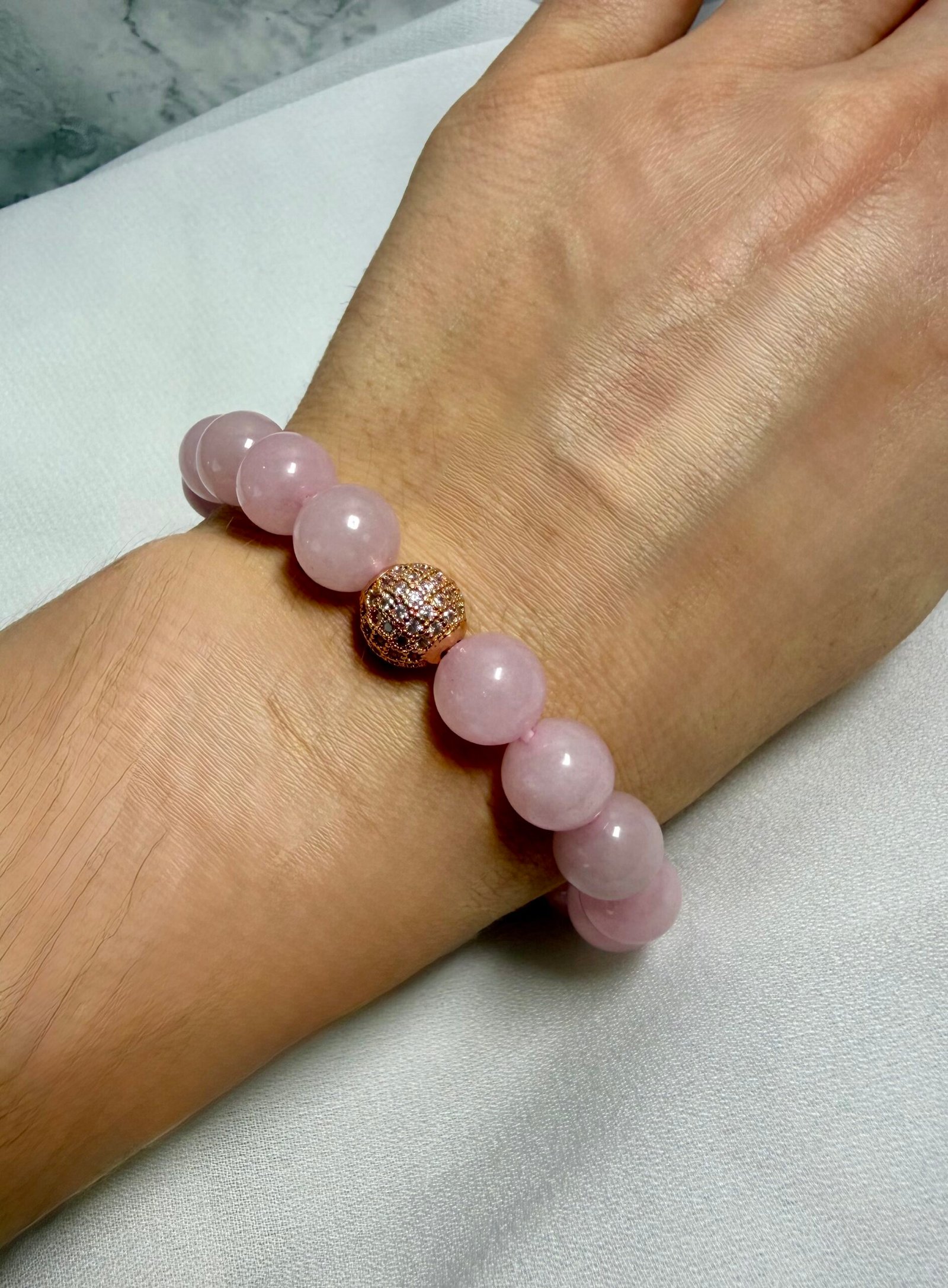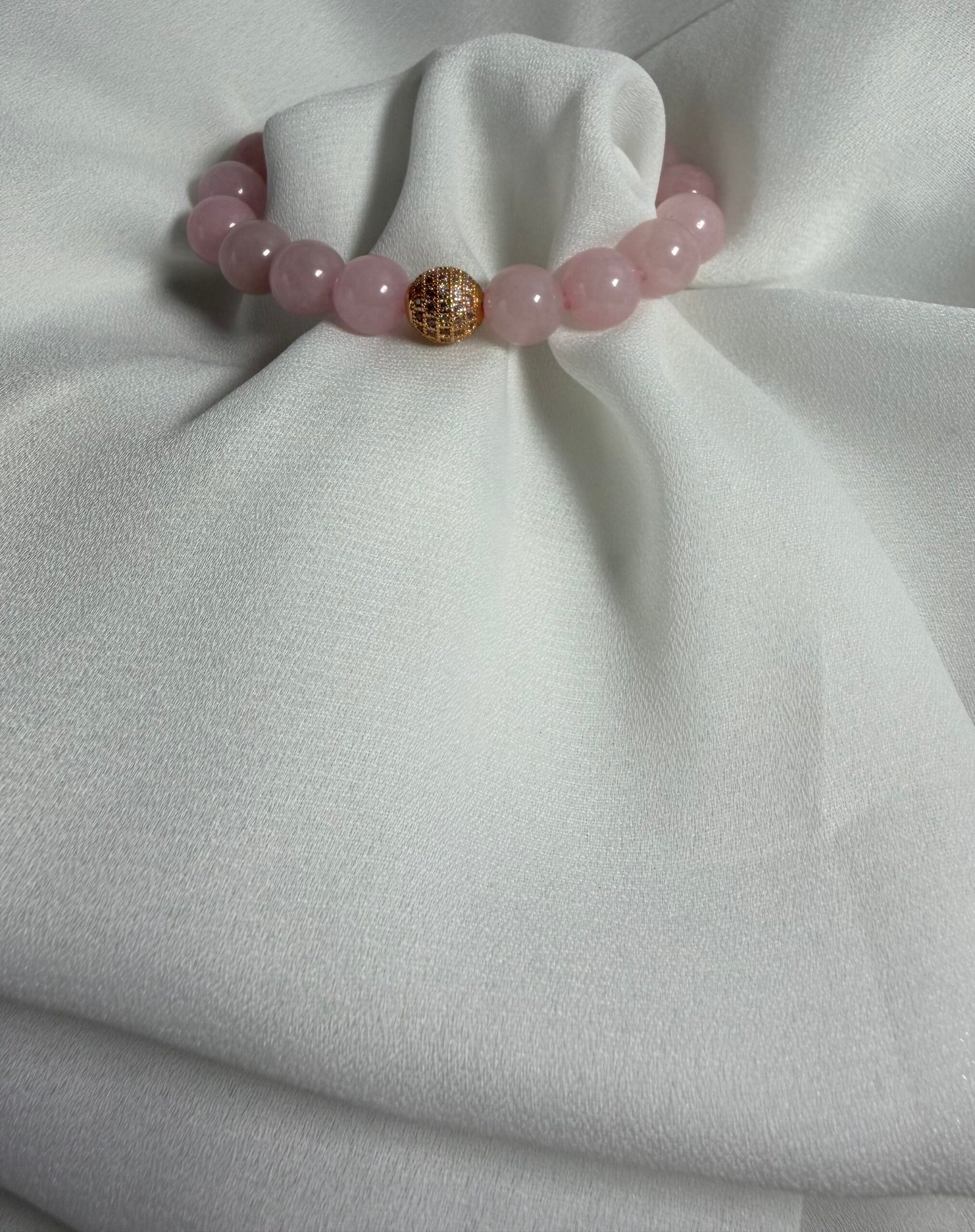 Medžiagos: natūralus rožinis kvarcas 10 mm, raudono aukso spalvos detalė su cirkonio akutėmis, elastinga guma.