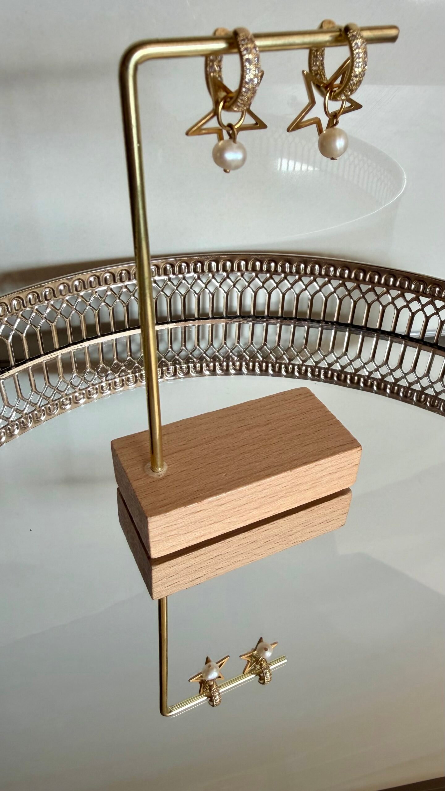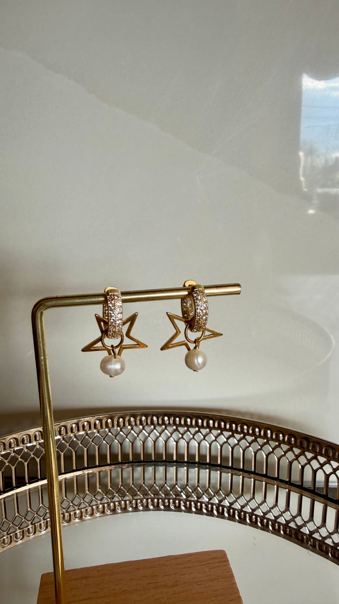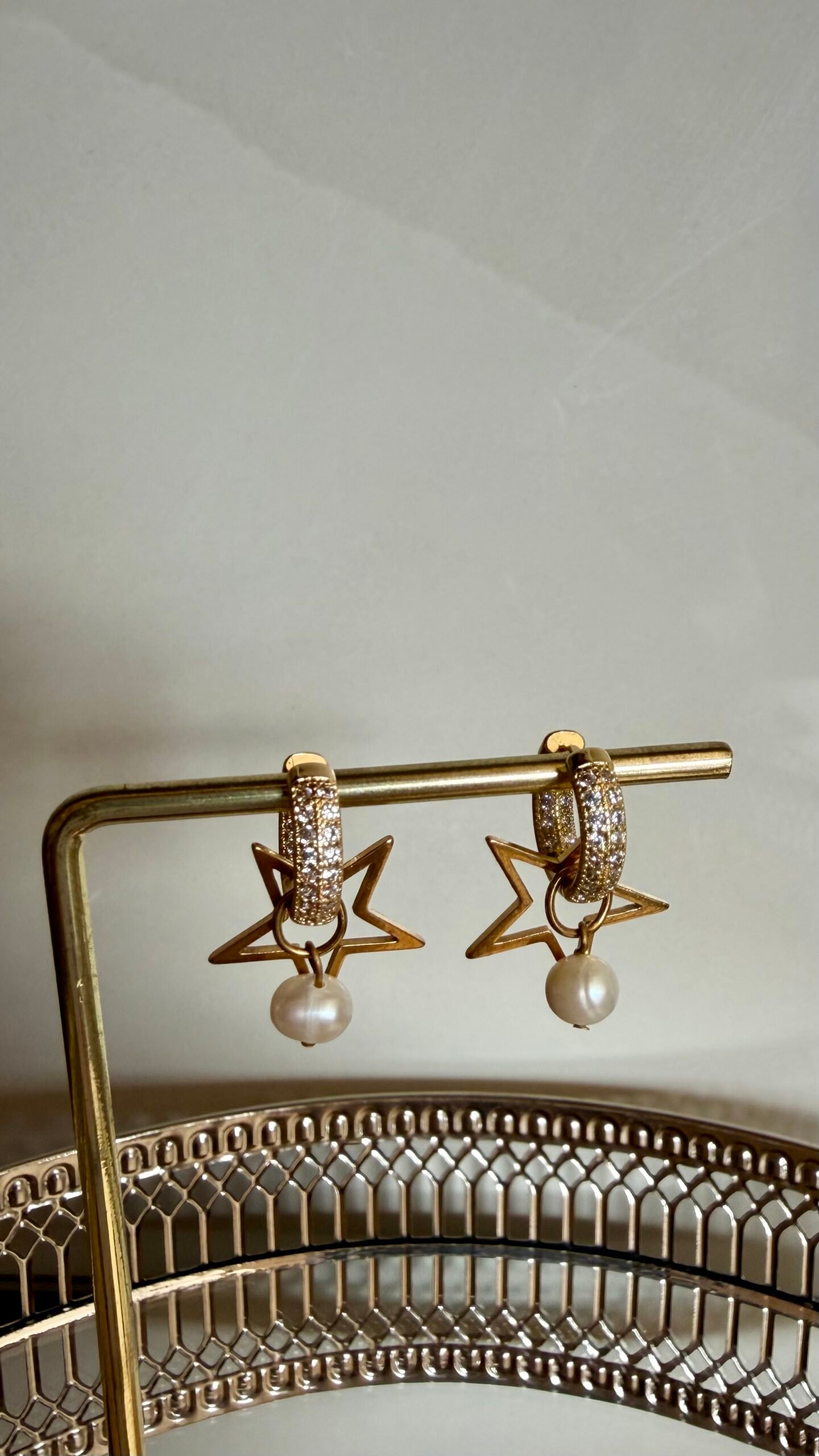 Auskarai iš nerūdijančio plieno, padengti 18K aukso spalva, su cirkonio akutėmis dekoruotais lankeliais, žvaigždutės pakabuku ir natūraliu upiniu perlu. Subtilus ir elegantiškas pasirinkimas.