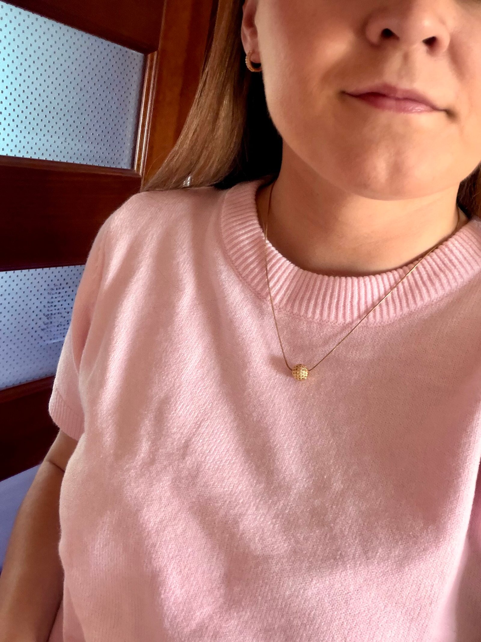 Elegantiškas ir subtilus vėrinys, įkvėptas lengvumo ir moteriškumo. Pagamintas iš aukso spalvos nerūdijančio plieno grandinėlės, kuri yra atspari kasdieniam nešiojimui ir ilgai išlieka spindinti. Vėrinio centre – cirkonio akutėmis dengtas karoliukas, suteikiantis švelnaus žėrėjimo ir išskirtinumo. Grandinėlės ilgis 45 cm su papildomu 6 cm prailginimu, todėl lengvai prisitaiko prie skirtingo kaklo ilgio. Karoliuko dydis apie 10 mm. Puikiai tinka tiek kasdienai, tiek ypatingoms progoms.
