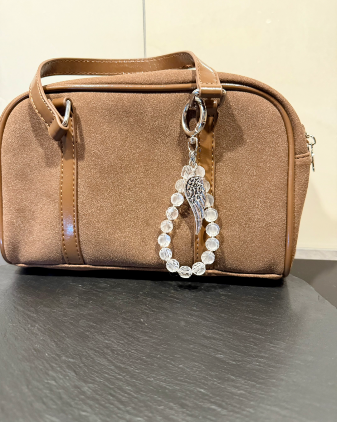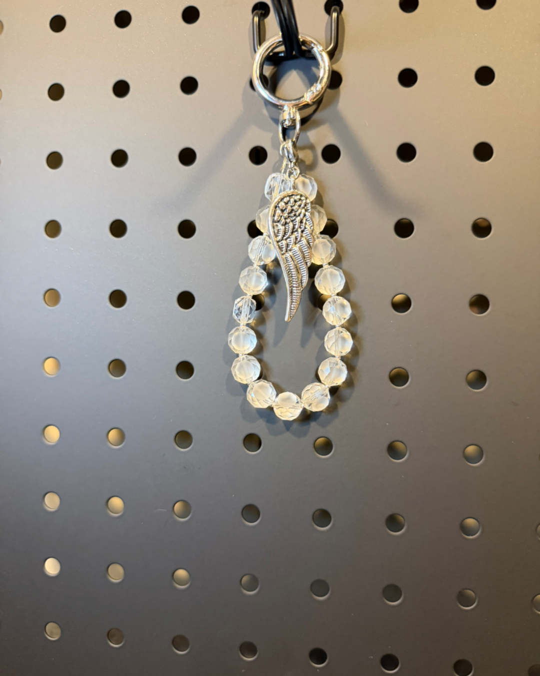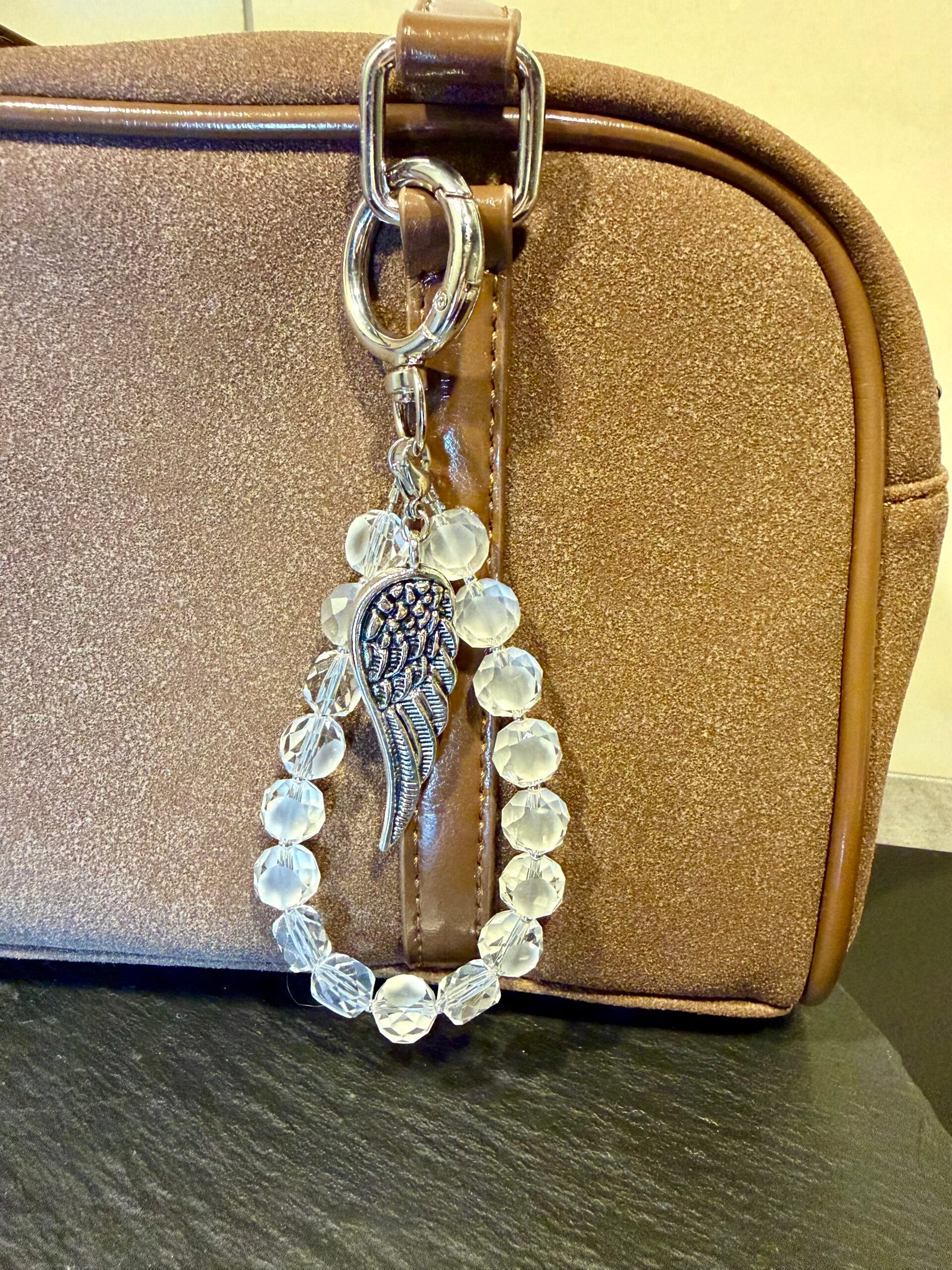 Pakabuką papildo sidabro spalvos angelo sparno pakabukas, simbolizuojantis apsaugą, ramybę ir šviesą. Derinys atrodo lengvas, elegantiškas ir universaliai pritaikomas – puikiai tinka raktams, rankinei ar kuprinei.