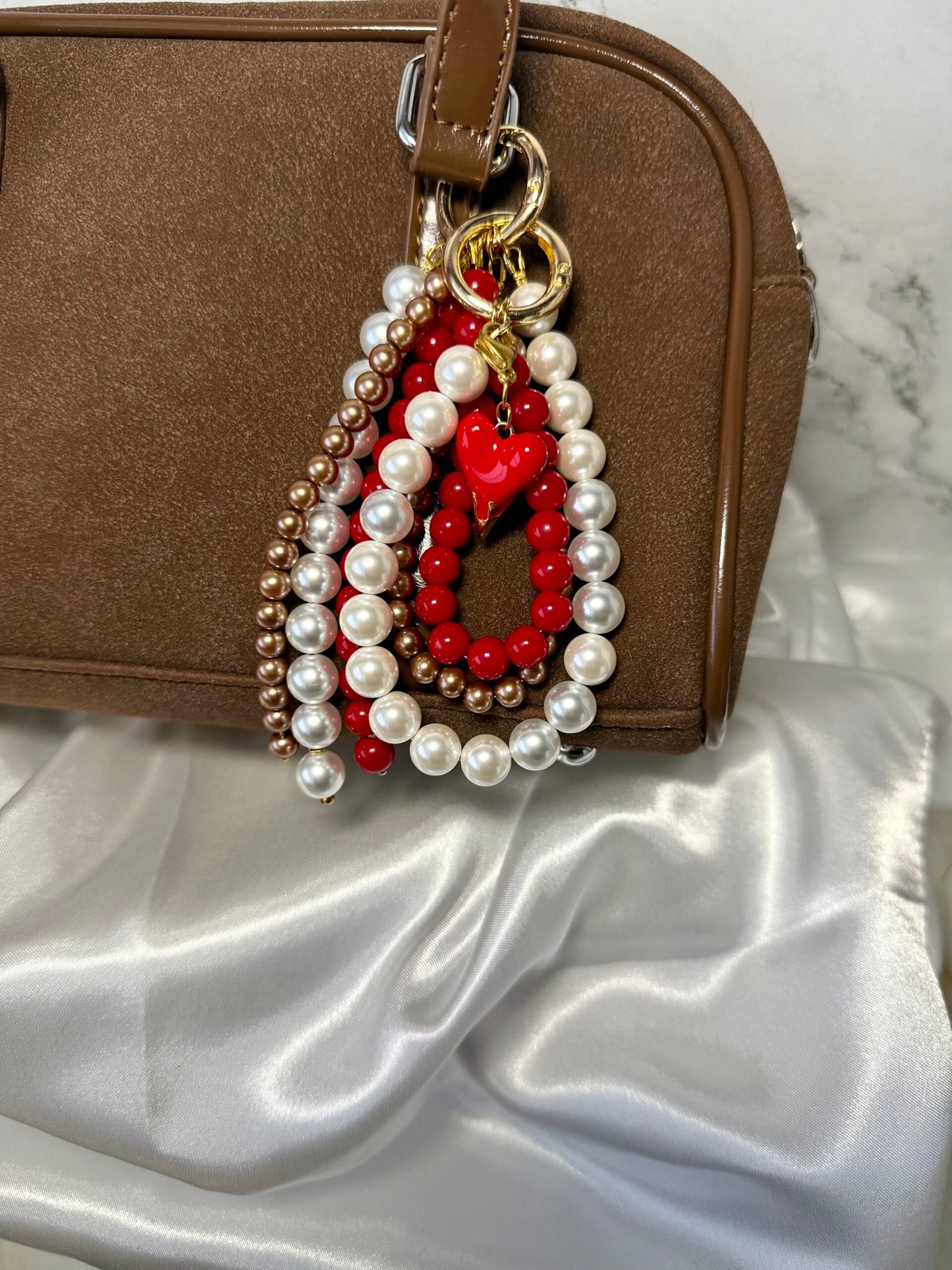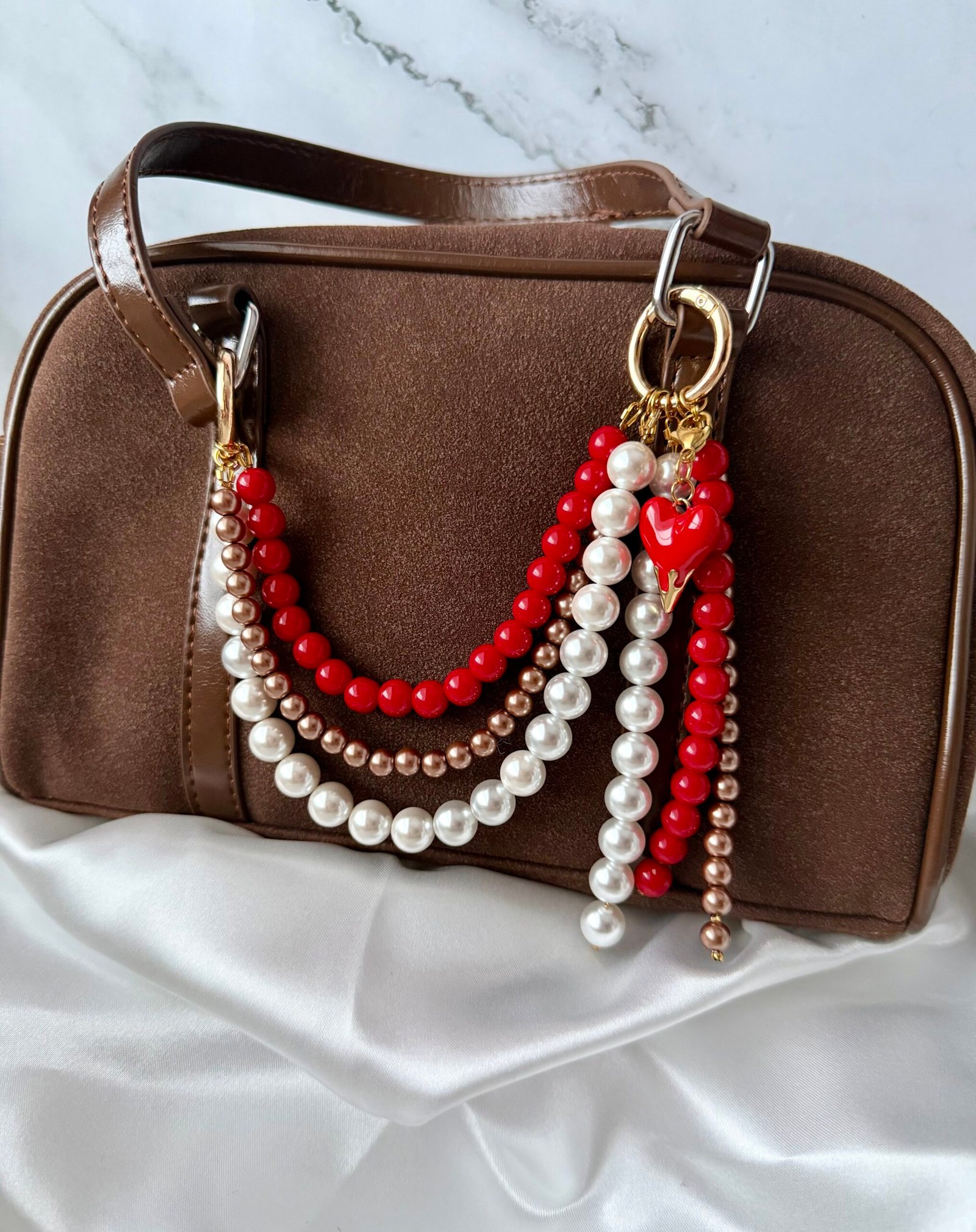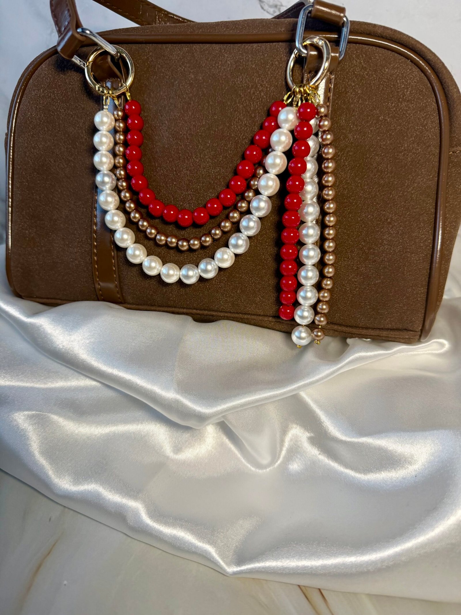 Naudoti perlų imitacijos 10 mm, raudoni koralo spalvos 8 mm ir stikliniai rudi 6 mm karoliukai.