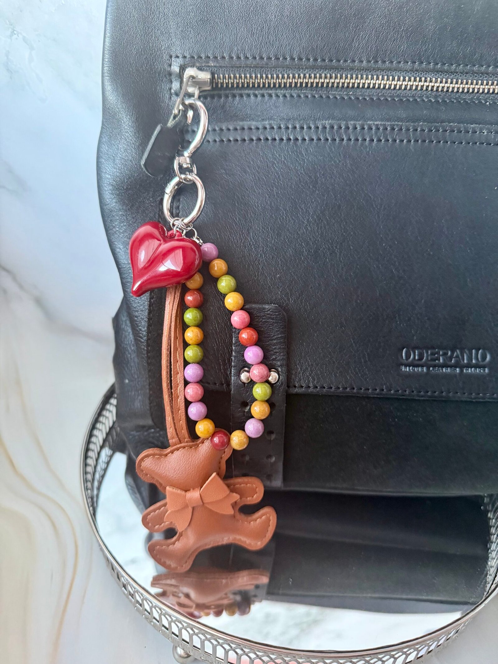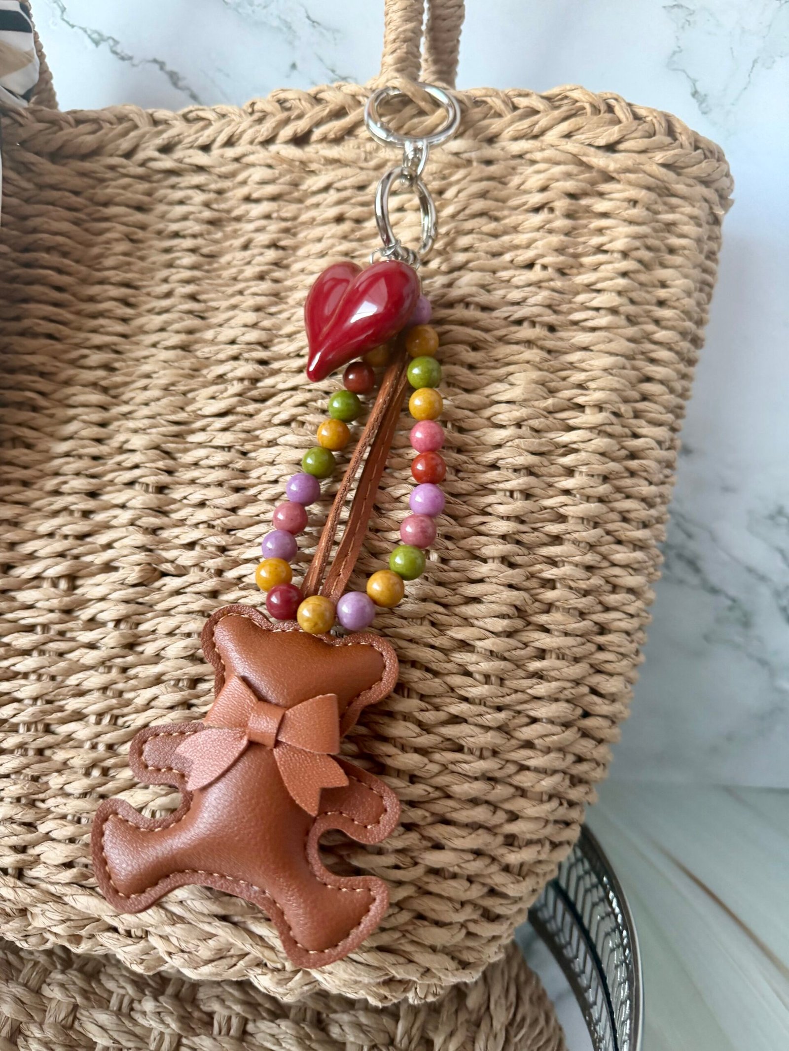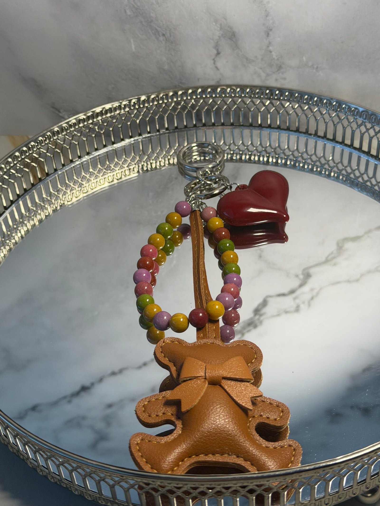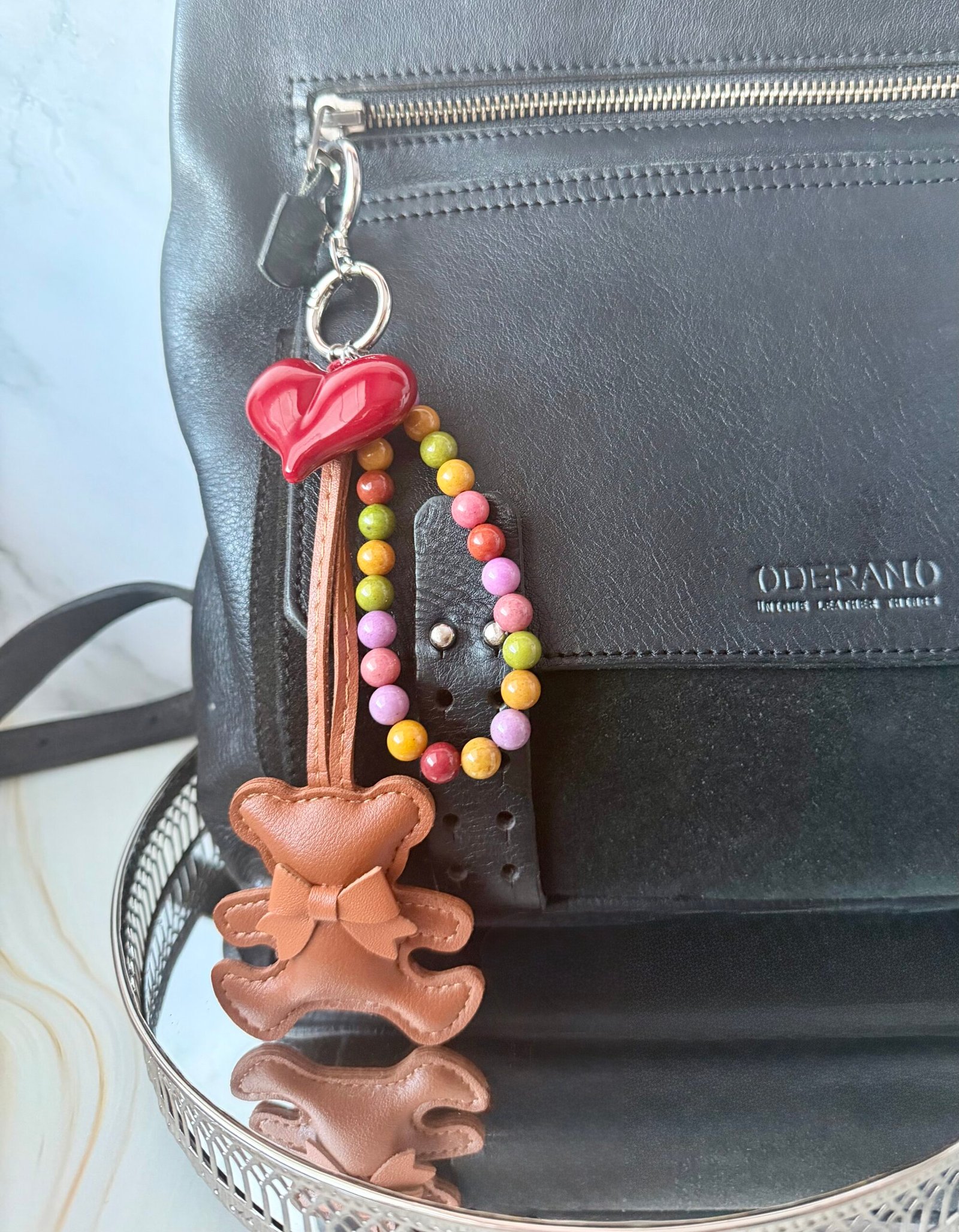 Šis pakabukas išsiskiria žaismingu ir šiltu dizainu. Aksesuarą puošia dirbtinės odos meškutis, akrilinė širdelė ir 8 mm agato karoliukai, suteikiantys spalvų bei gyvumo pojūtį.
