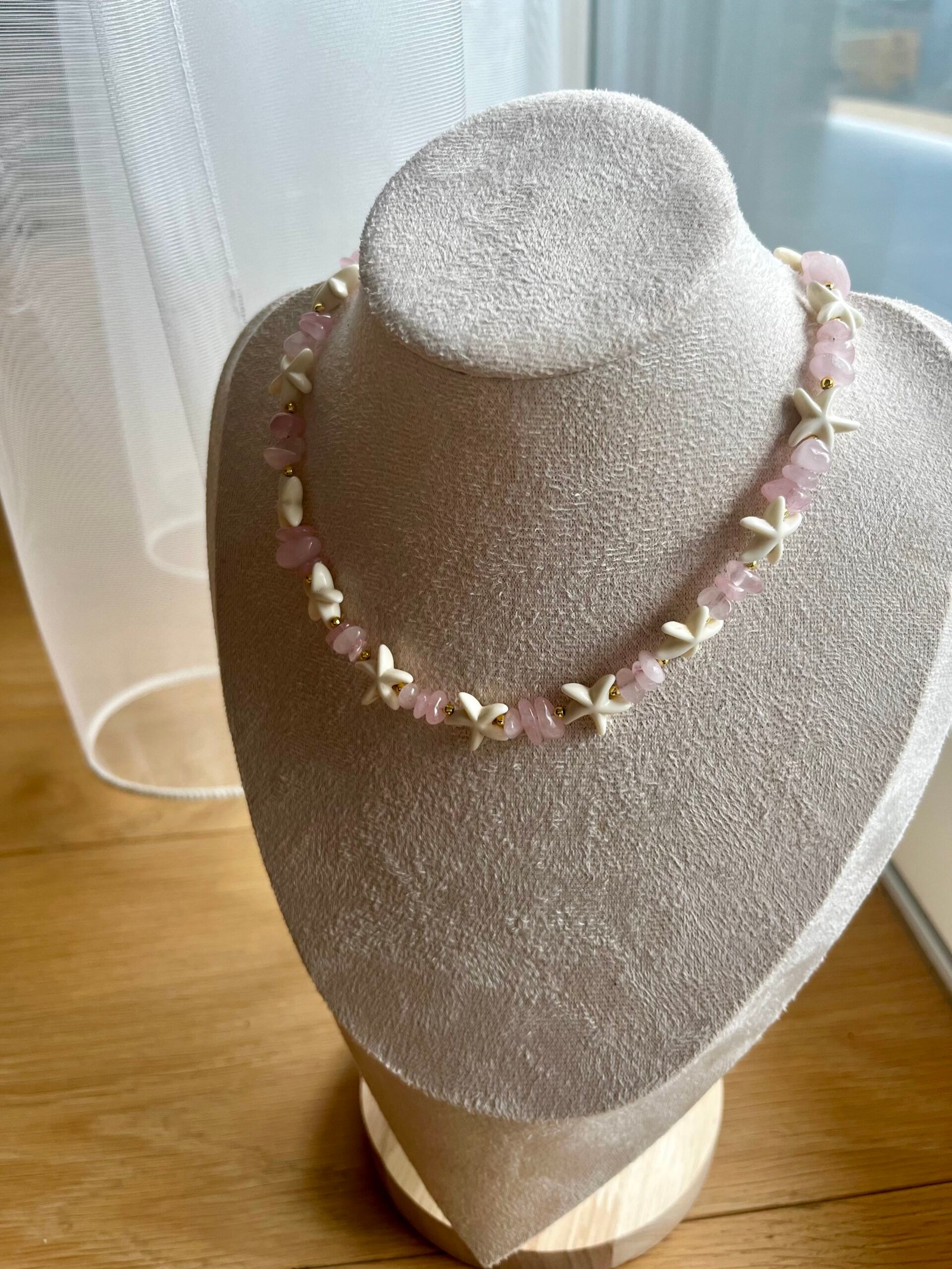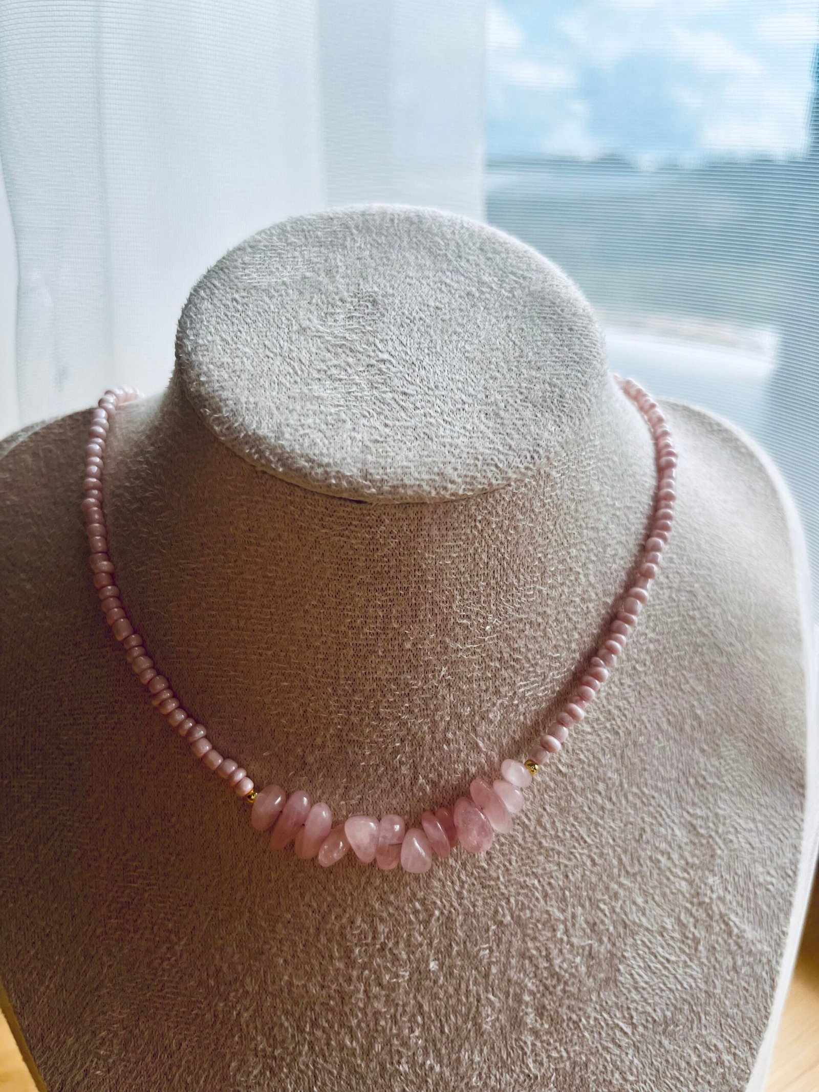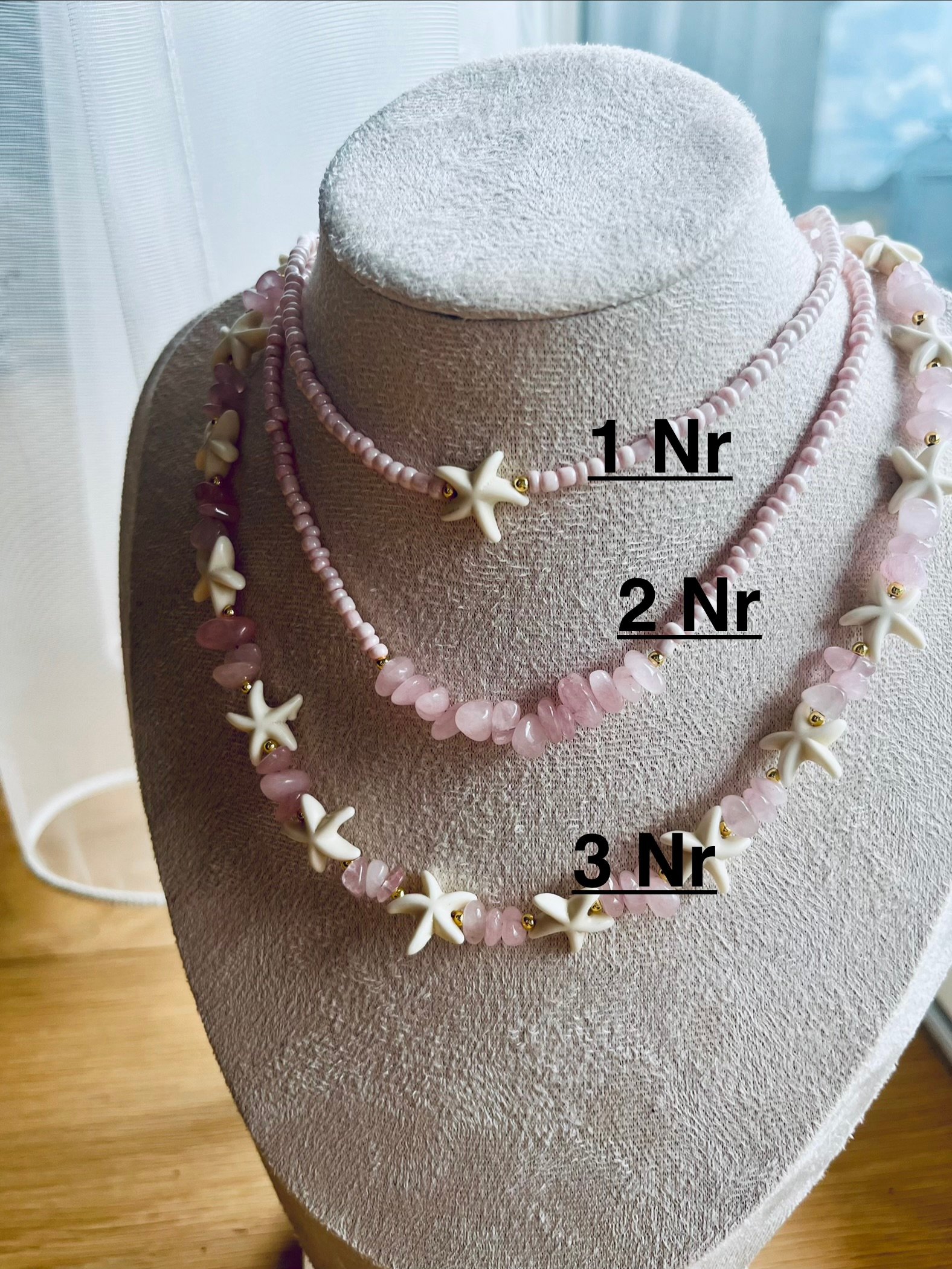 • 2 Nr. – rožinis biseris, papildytas netaisyklingos formos natūraliu rožiniu kvarcu. Švelni, moteriška elegancija.