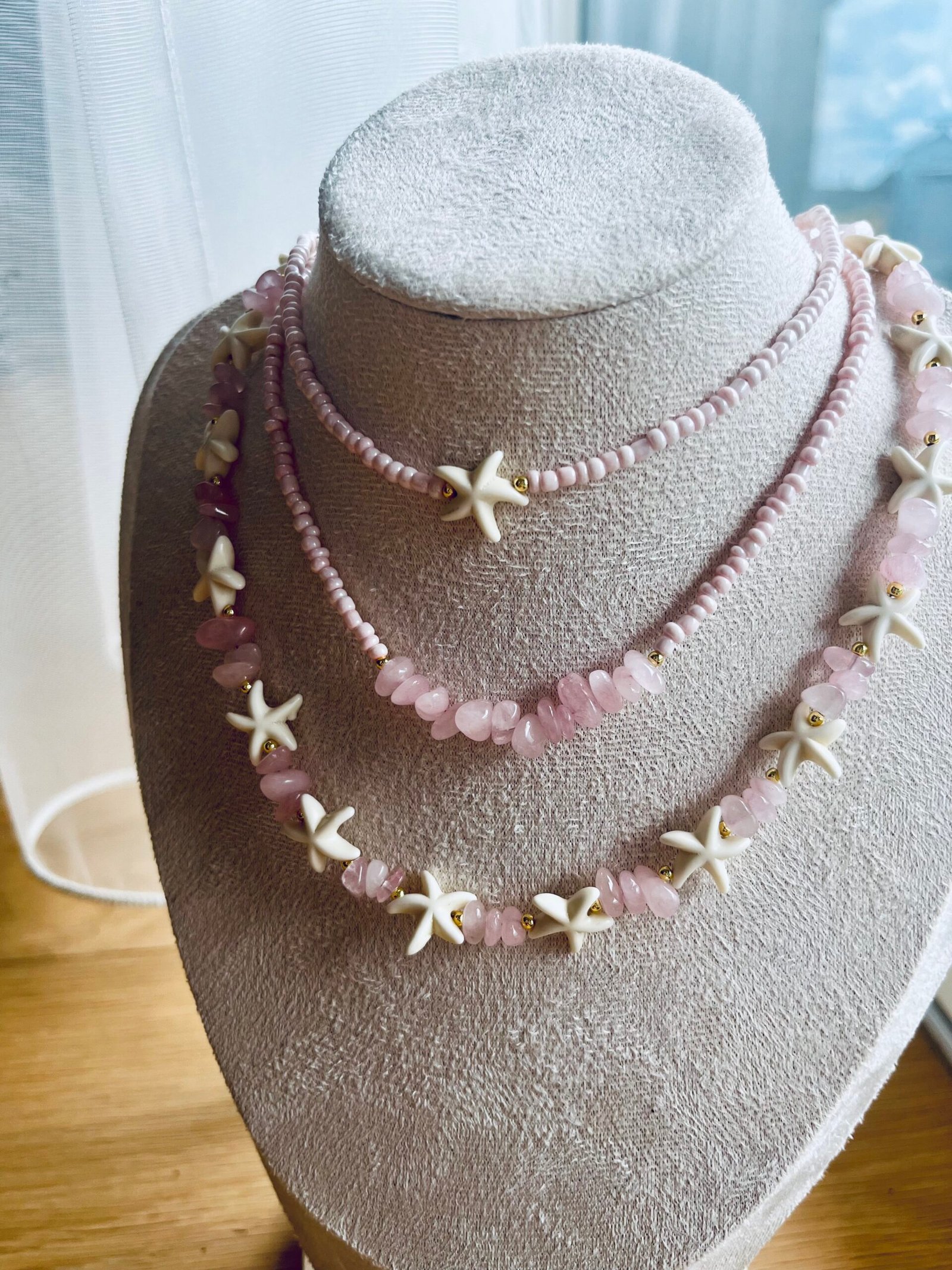 „Rožinė gama“ – tai trijų skirtingų, tačiau tarpusavyje derančių vėrinių kolekcija, sukurta iš švelnių rožinių atspalvių ir natūralių akmenų.