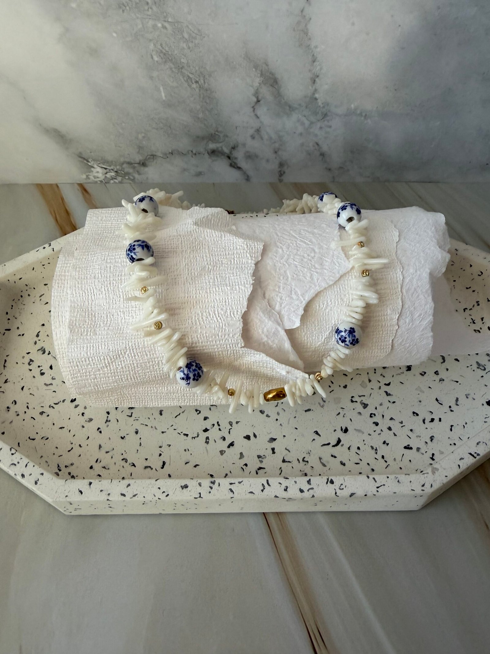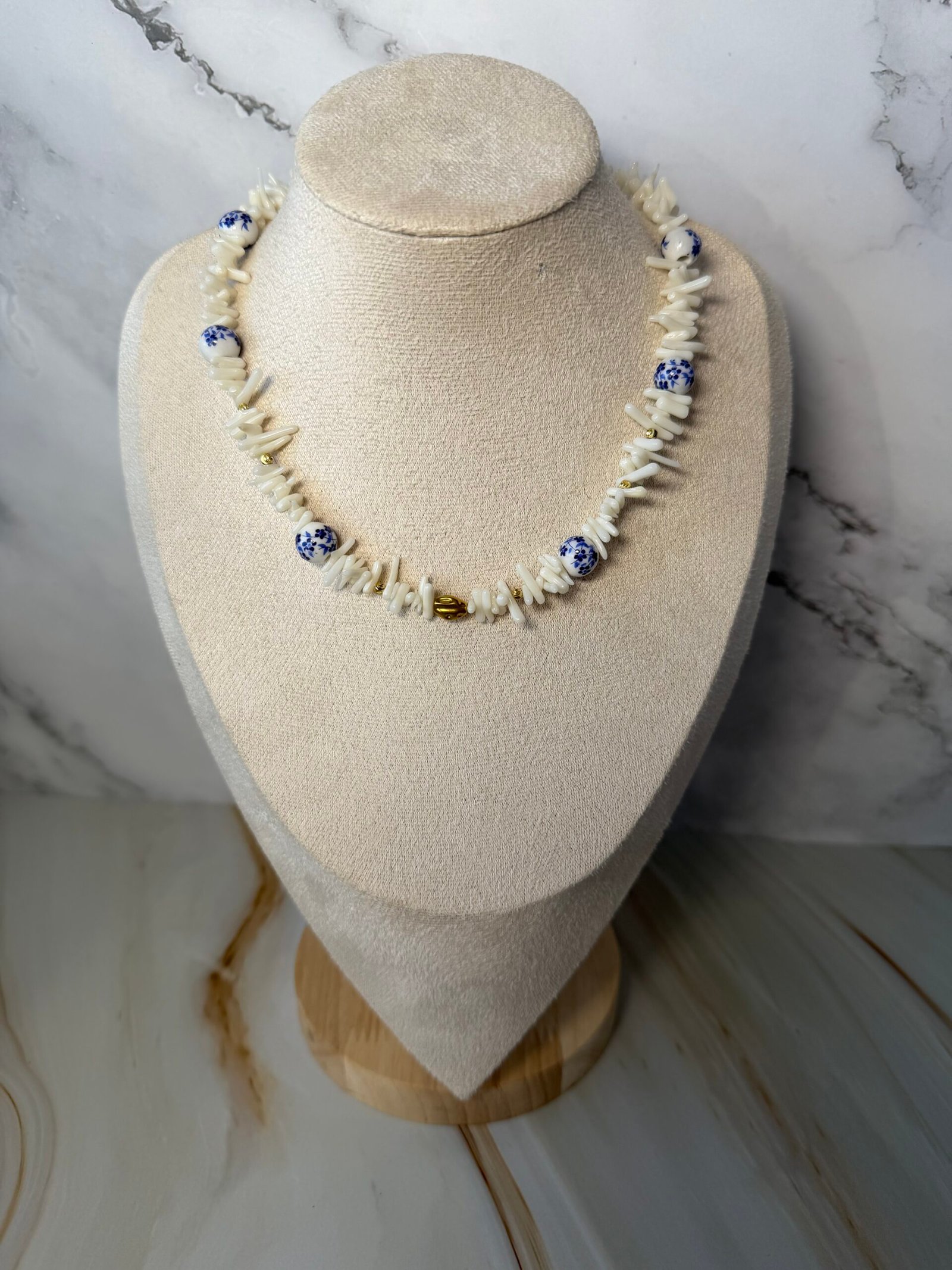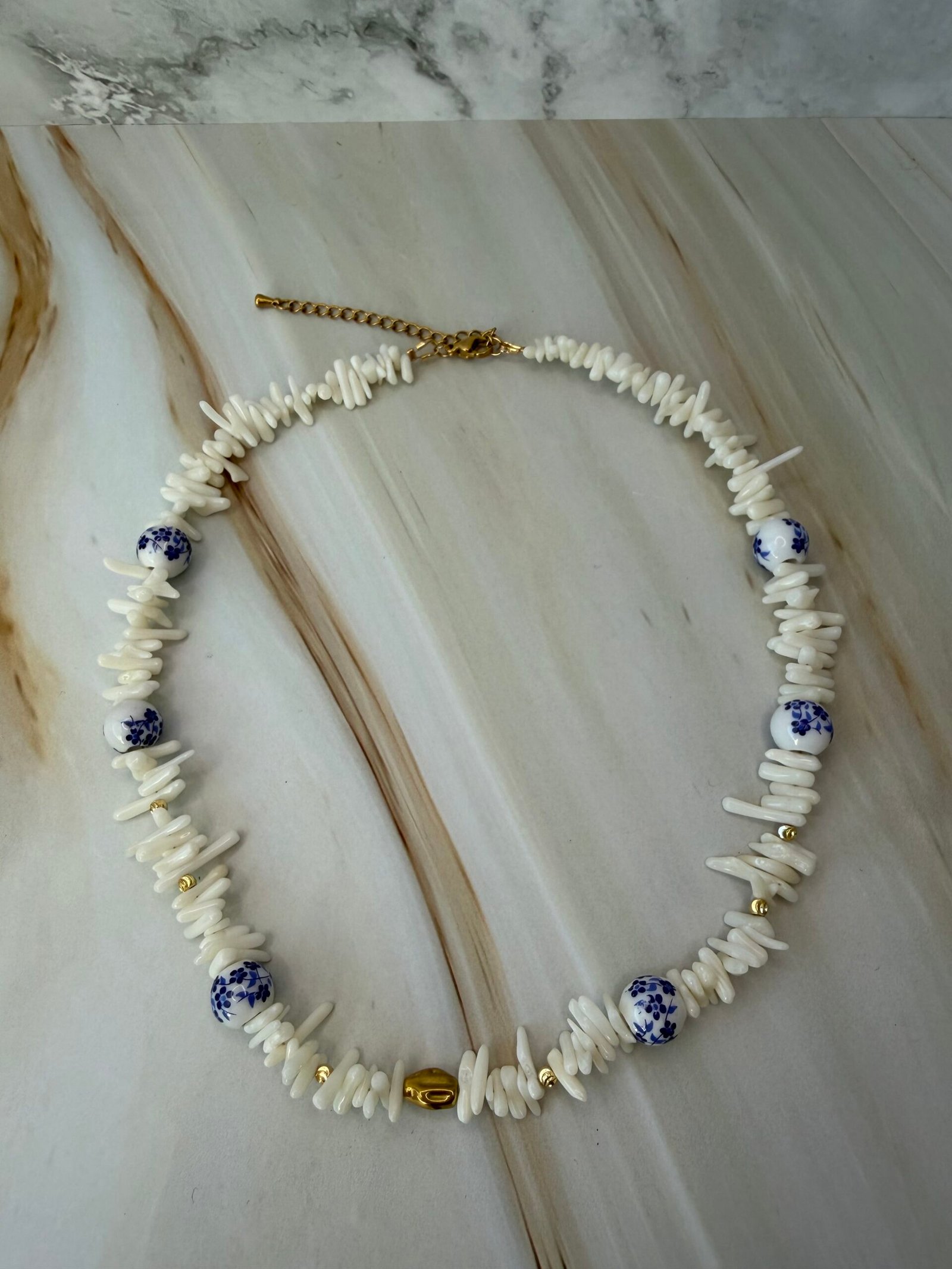 Lengvas ir gaivus kaklo vėrinys iš baltų kriauklių karoliukų, dekoruotas keraminiais karoliukais su mėlynais akcentais ir nerūdijančio plieno detalėmis.