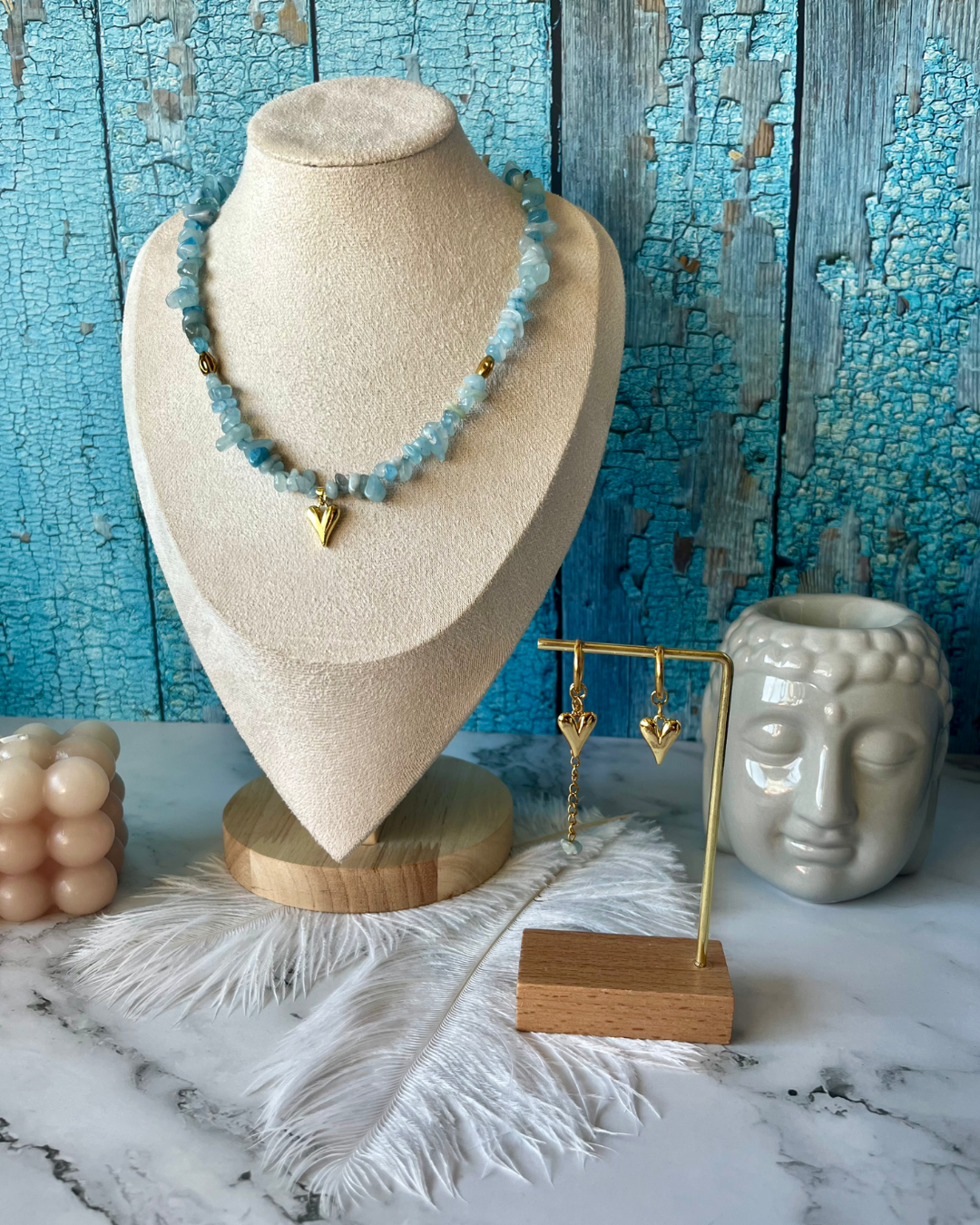 Kiekvienas akmuo unikalus – skirtingos formos, švelnių melsvų atspalvių, su natūraliomis tekstūromis, todėl kiekvienas komplektas turi savo išskirtinumą.