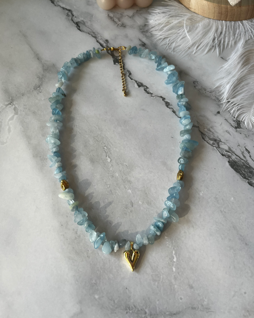 Rankų darbo papuošalų komplektas iš netaisyklingos formos (chip) natūralaus akvamarino akmenų.
