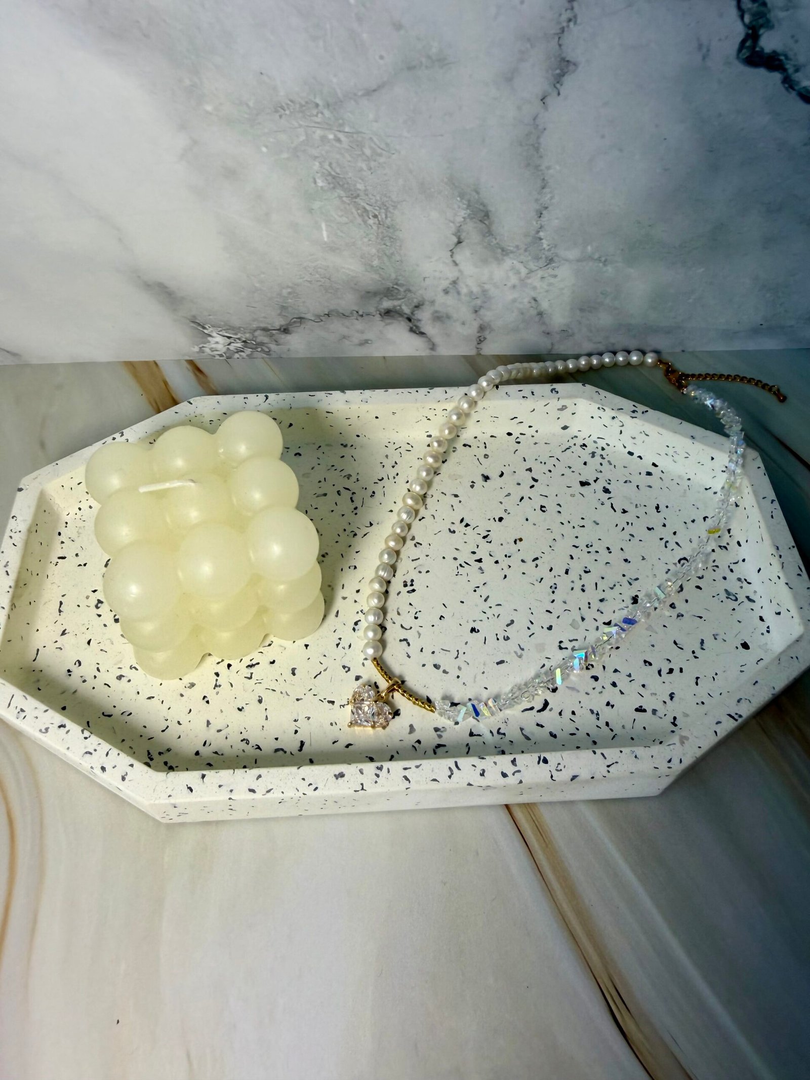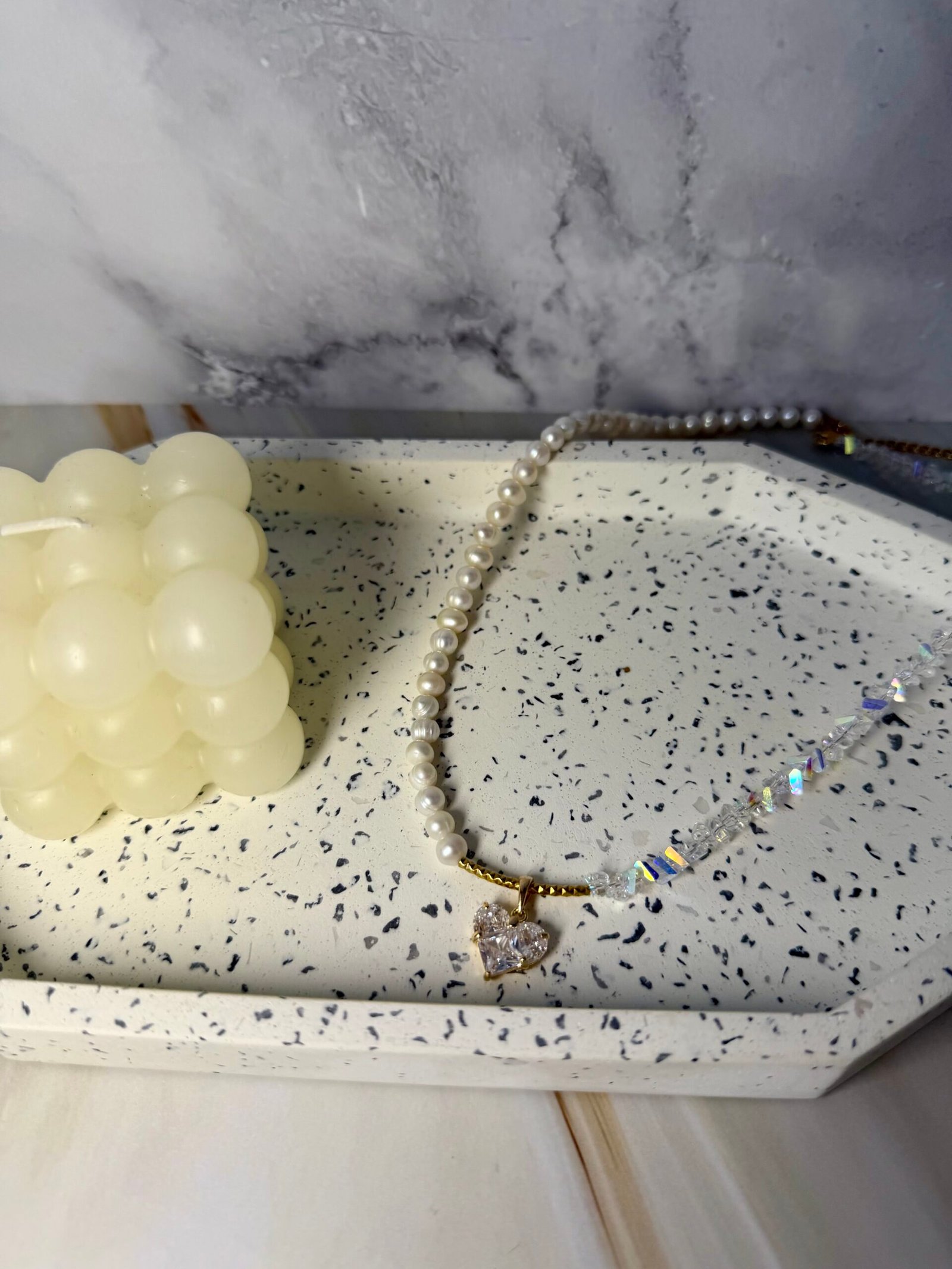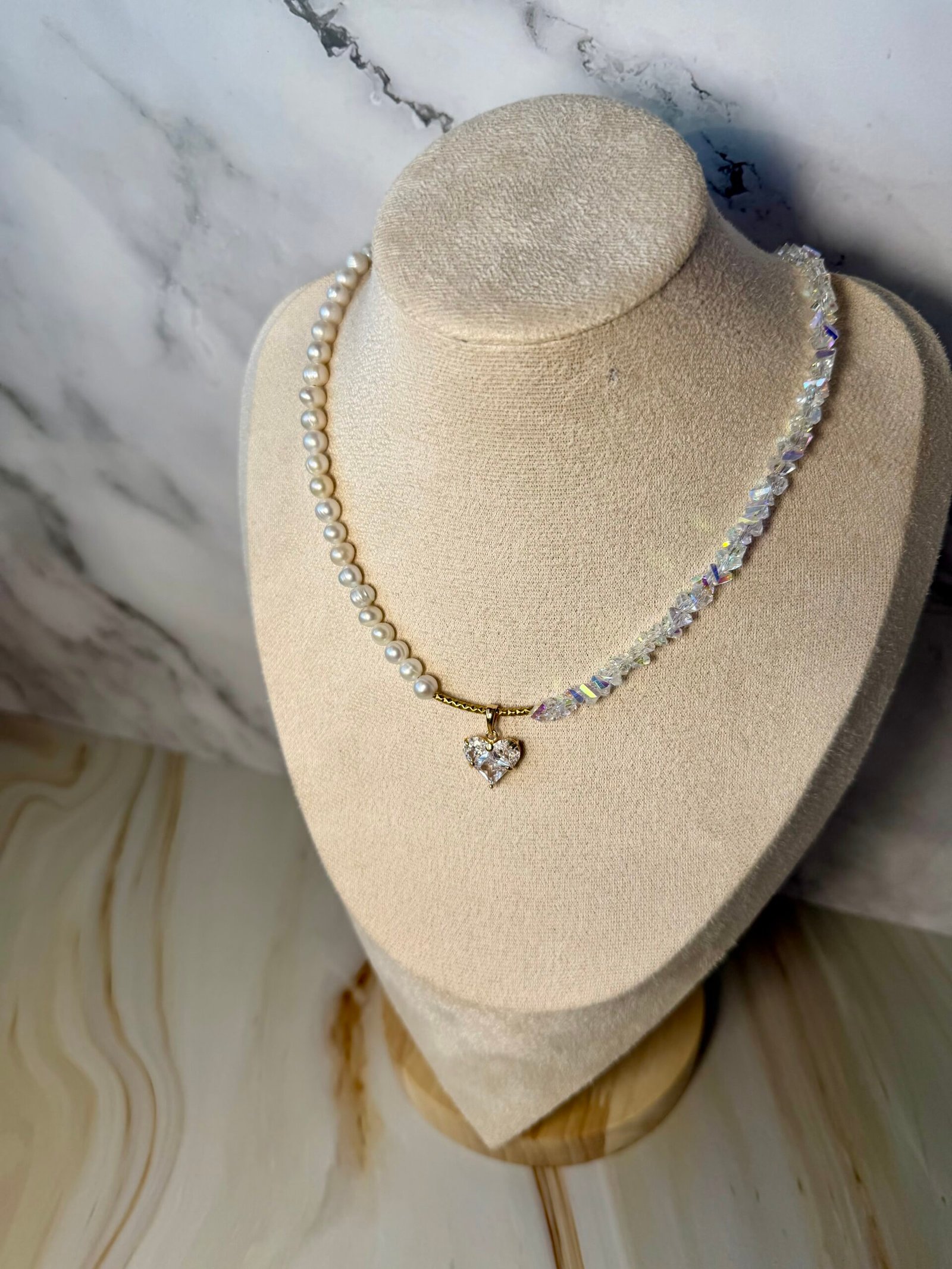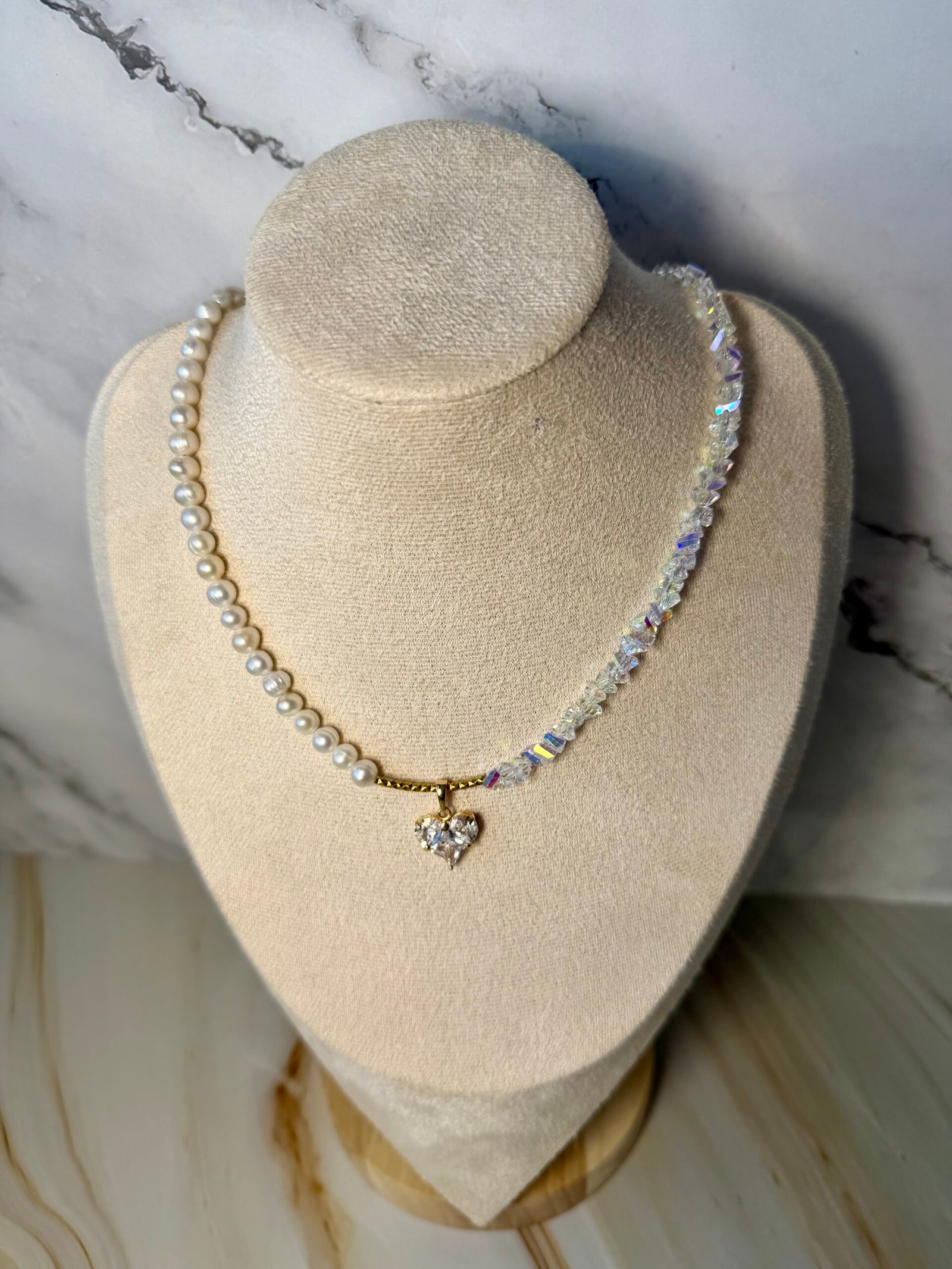 Šis kaklo vėrinys sukurtas derinant upinius perlus ir kristalus, kurie harmoningai susilieja į elegantišką ir šviesų papuošalą. Perlų natūralumas ir kristalų spindesys suteikia vėriniui subtilios prabangos bei išskirtinumo.